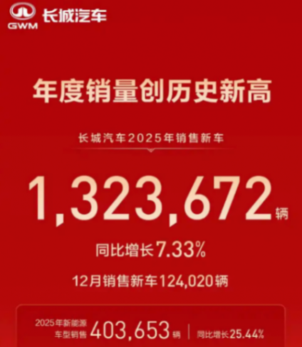 根據戰報圖來看,長城汽車創造了銷量新高,去年累計賣出了超132萬輛新車,相比起2024年的123萬輛,同比增長了7.33%。在備受關注的新能源車型這邊,賣出了超40萬輛新車,同比增長25.44%。