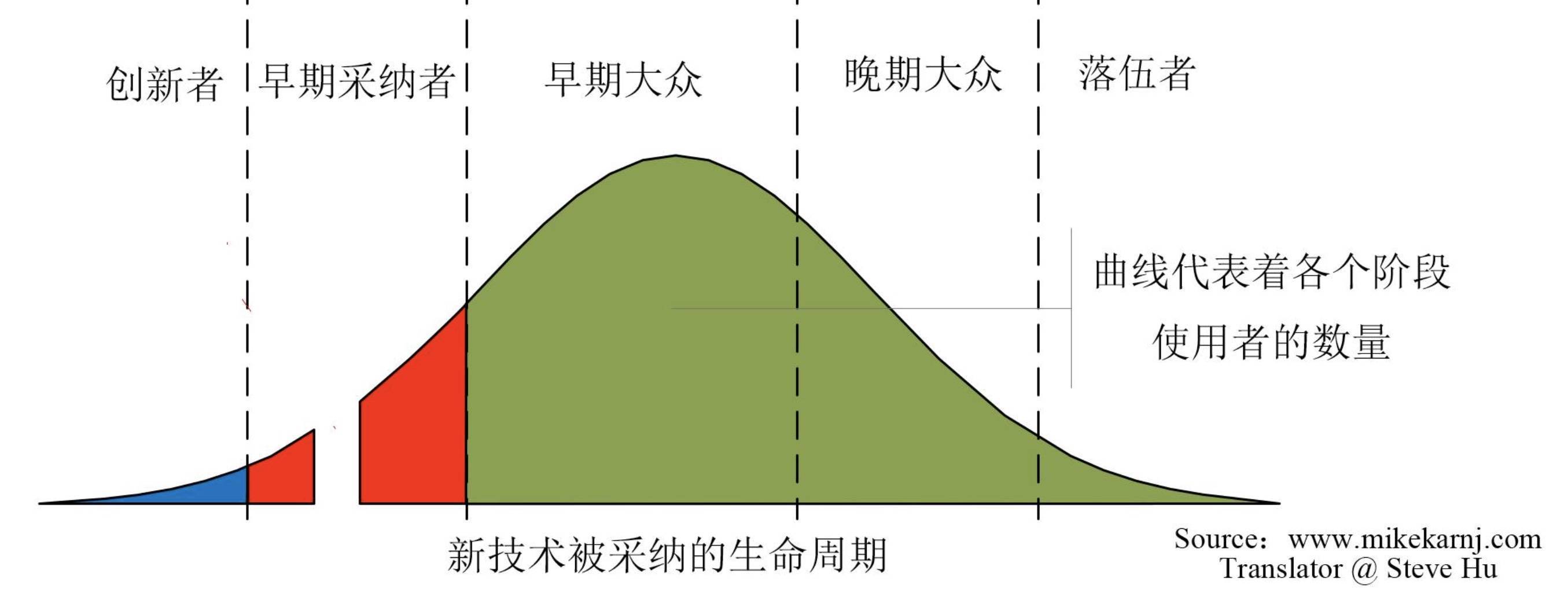 營銷學(xué)上有個(gè)著名的 「技術(shù)采納生命周期」 理論——任何創(chuàng)新產(chǎn)品的普及都會經(jīng)歷幾個(gè)階段:從熱衷嘗鮮的 「創(chuàng)新者」,到具備前瞻眼光的 「早期使用者」,再到務(wù)實(shí)的 「晚期大眾」。