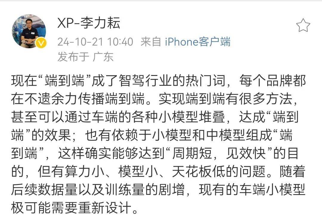 小模型的說法來自小鵬自動駕駛負責人李力耘,他的表態一方面揭露了半年前的小鵬端到端大模型“即非端到端,是名端到端”的實際。