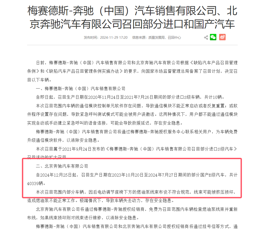 注意了,本月下旬正式實施,奔馳又將在國內車市召回了。其中,涉及到4萬多臺國產奔馳E級車型。國家市場監督管理總局官網消息顯示,從2024年12月25日,北京奔馳將會在國內車市召回部分國產奔馳E級車輛。