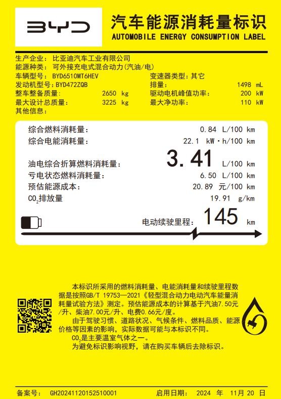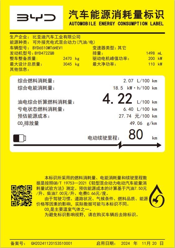 動力方面,比亞迪夏采用1.5T發動機+單電機組成的插電混動系統。1.5T發動機最大功率115kw,電動機為永磁同步電機,型號為TZ210XYD,生產企業為鄭州比亞迪汽車有限公司,最大功率200kw。從動力輸出數據來看,夏還要略優于騰勢D9 DM-i車型。動力電池方面,夏采用襄陽弗迪電池有限公司生產的磷酸鐵鋰電池。