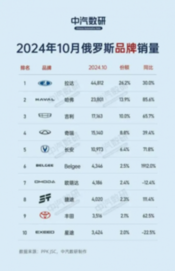 俄羅斯是中國(guó)汽車海外最大的單一市場(chǎng),長(zhǎng)城的哈弗品牌在10月份排名第二、奇瑞有四個(gè)品牌(奇瑞、歐萌達(dá)、捷途、星途)進(jìn)入前十。