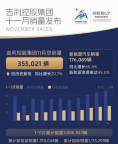 吉利汽車在海外市場(chǎng)的影響力正迅速上升。根據(jù)中汽數(shù)研的數(shù)據(jù),今年11月,吉利的海外銷量達(dá)到了32,800輛,比去年同期增長(zhǎng)了超過(guò)13%。從年初到11月底,累計(jì)出口量約為380,000輛。
