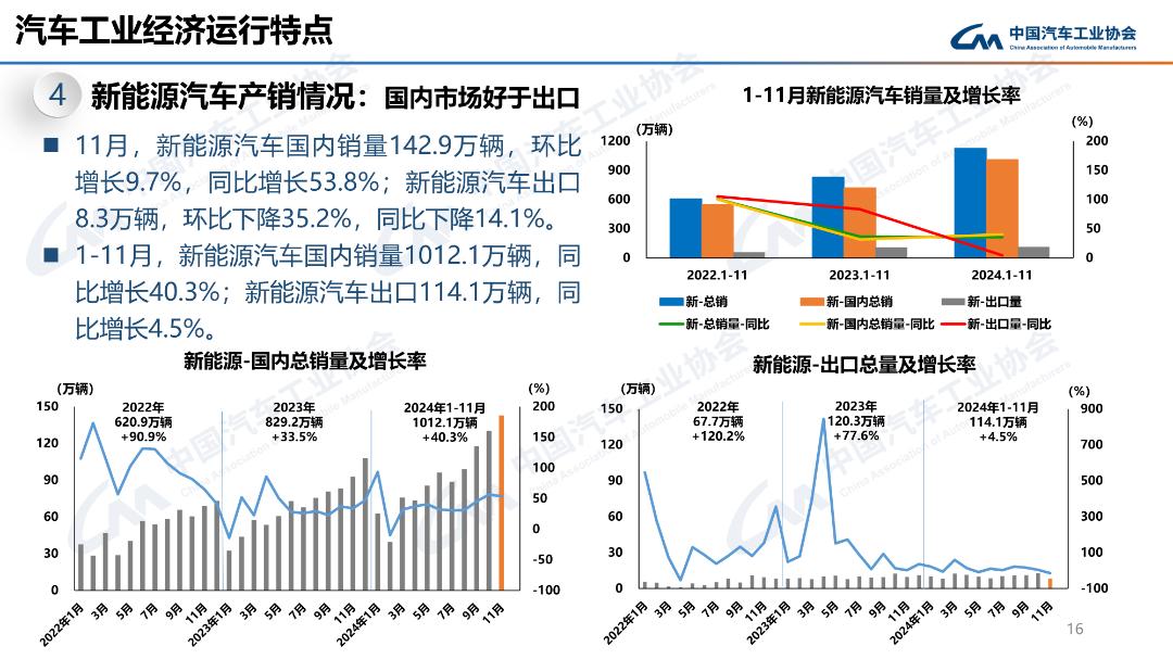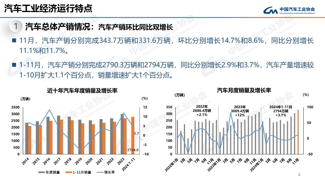 11月,汽車產(chǎn)銷分別完成343.7萬輛和331.6萬輛,環(huán)比分別增長14.7%和8.6%,同比分別增長11.1%和11.7%。1-11月,汽車產(chǎn)銷分別完成2790.3萬輛和2794萬輛,同比分別增長2.9%和3.7%,汽車產(chǎn)量增速較1-10月擴(kuò)大1.1個(gè)百分點(diǎn),銷量增速擴(kuò)大1個(gè)百分點(diǎn)。