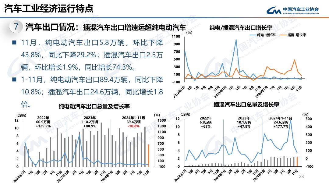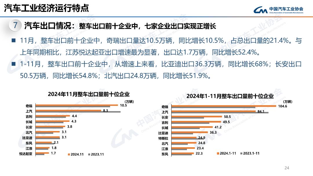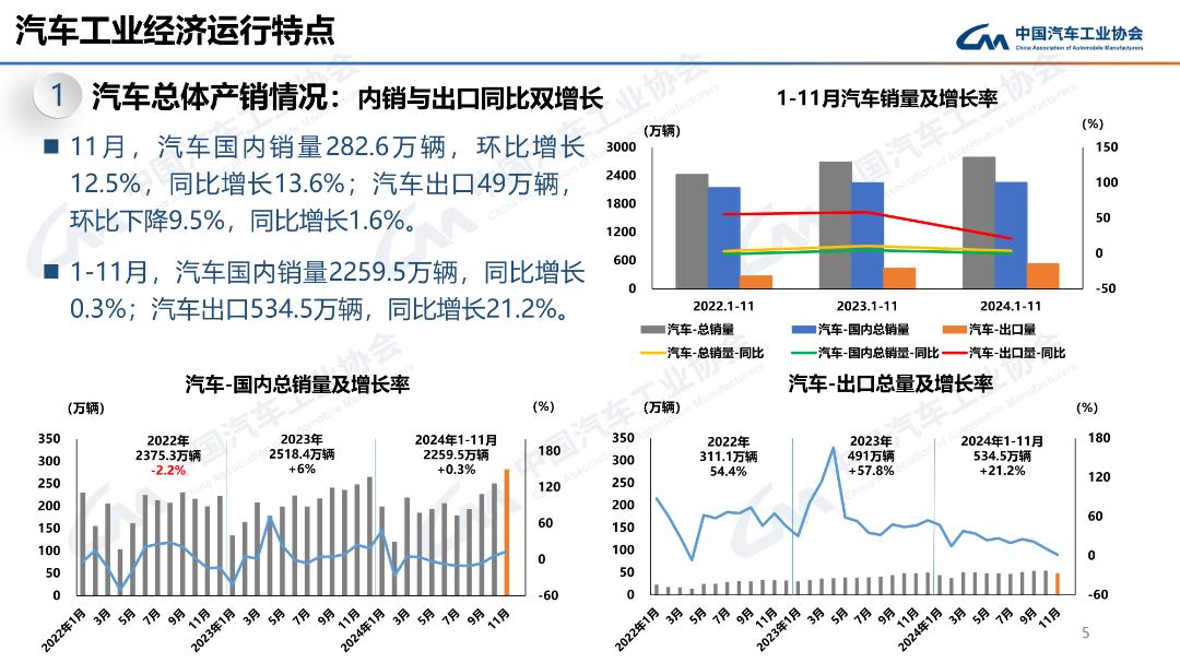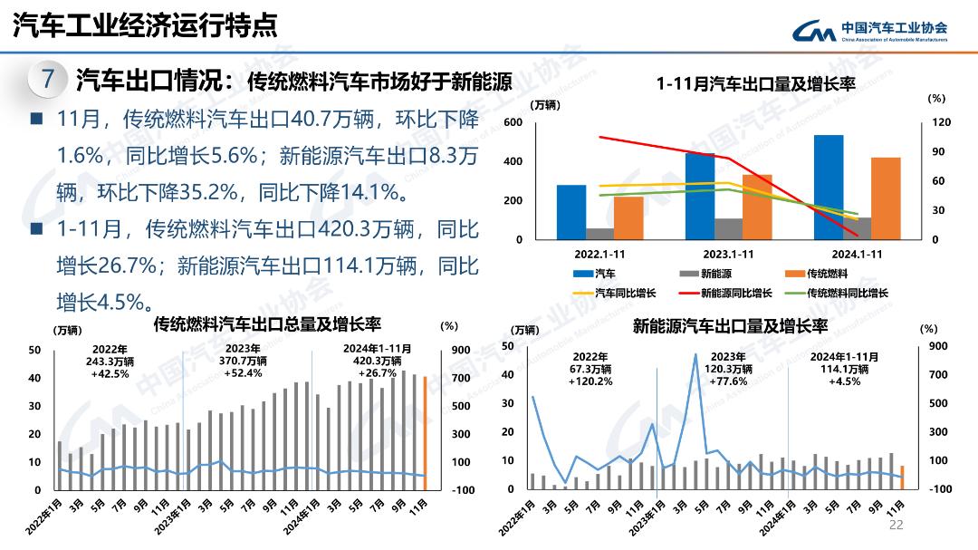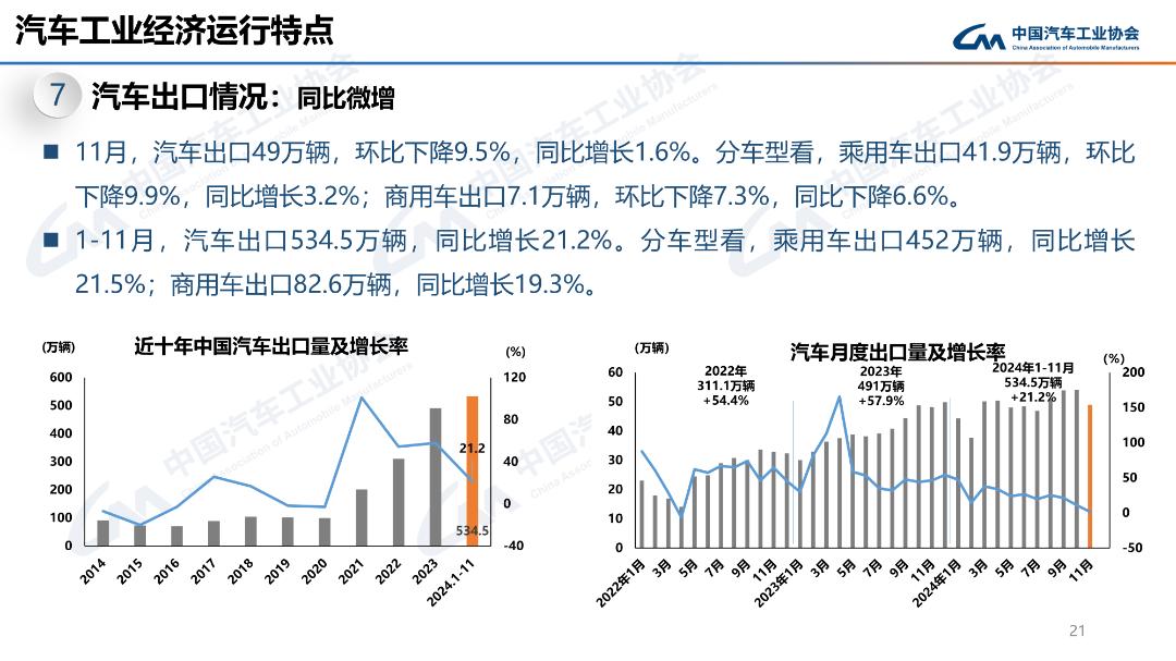 11月,汽車出口49萬輛,環(huán)比下降9.5%,同比增長1.6%。1-11月,汽車出口534.5萬輛,同比增長21.2%。