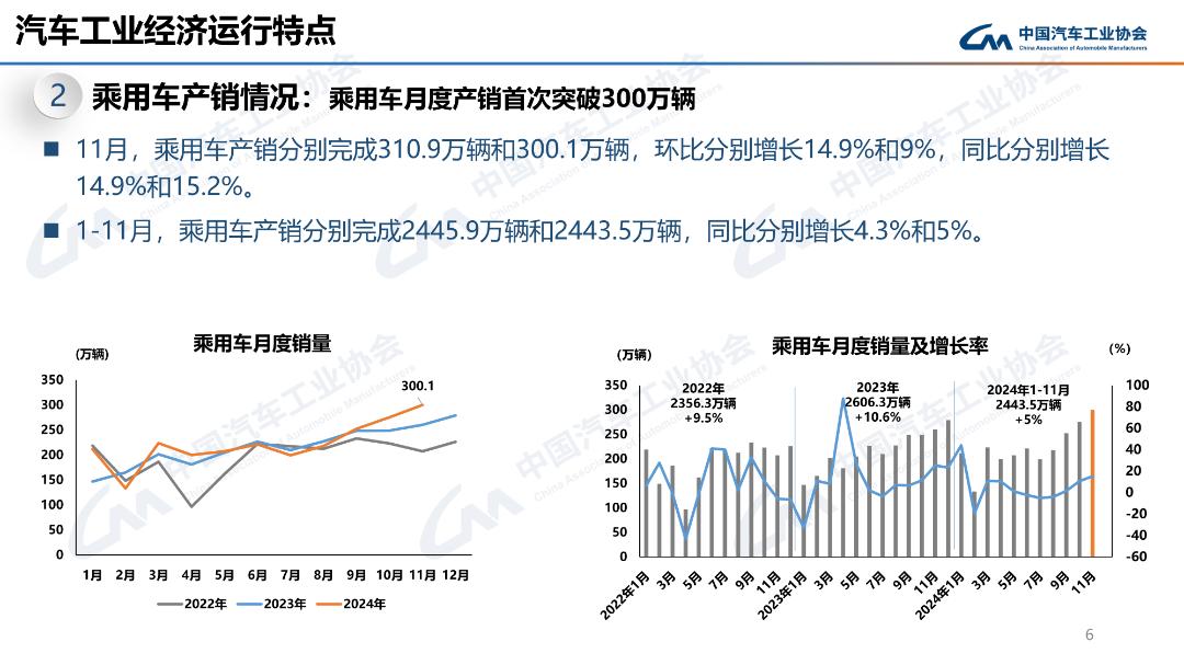 11月,乘用車產(chǎn)銷分別完成310.9萬輛和300.1萬輛,環(huán)比分別增長14.9%和9%,同比分別增長14.9%和15.2%。1-11月,乘用車產(chǎn)銷分別完成2445.9萬輛和2443.5萬輛,同比分別增長4.3%和5%。