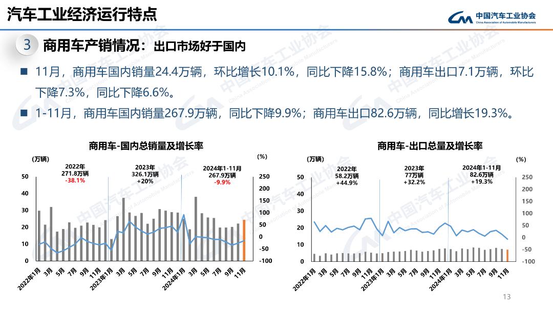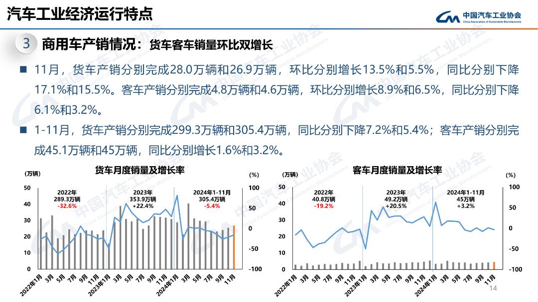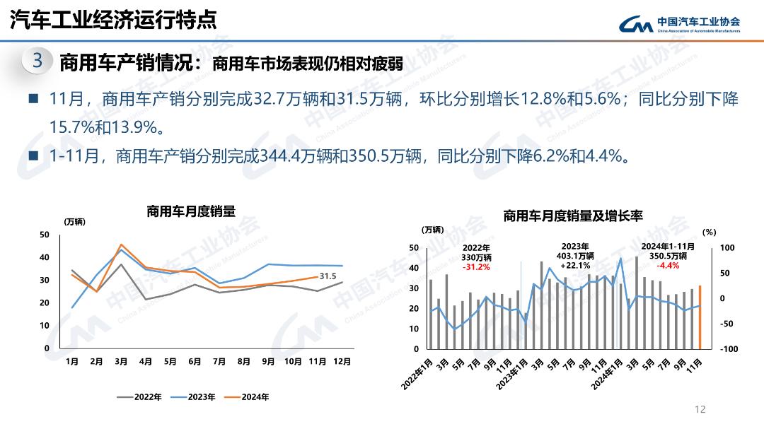 11月,商用車產(chǎn)銷分別完成32.7萬輛和31.5萬輛,環(huán)比分別增長12.8%和5.6%;同比分別下降15.7%和13.9%。1-11月,商用車產(chǎn)銷分別完成344.4萬輛和350.5萬輛,同比分別下降6.2%和4.4%。
