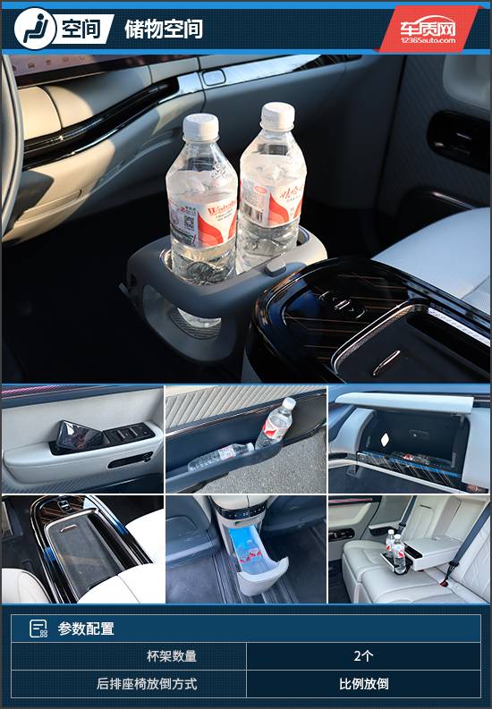 儲物空間方面,評測車只配備了后排的2個(gè)杯架,但可以通過購買拓展杯托為前排增加2個(gè)杯架。除了常規(guī)的儲物空間,評測車還選裝了車載冷暖冰箱,內(nèi)部容積達(dá)到10.9L,可進(jìn)行0-50°的溫度調(diào)節(jié),非常實(shí)用。