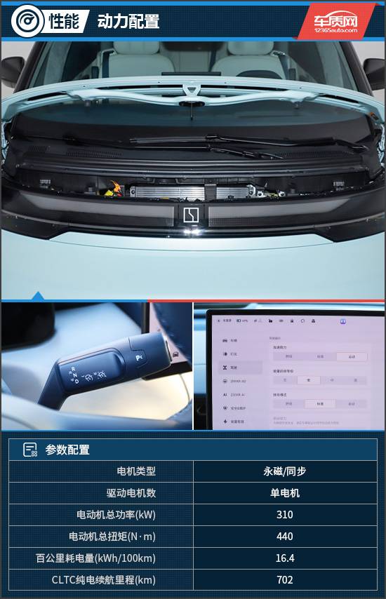評測車采用的是單電機(jī)后驅(qū),電機(jī)總功率310kW,總扭矩440N·m,百公里加速時(shí)間為6.8s。續(xù)航方面,CLTC純電續(xù)航里程為702km。