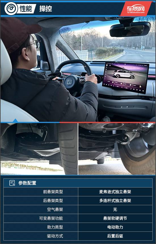 評測車采用的是前麥弗遜式獨(dú)立懸架+后多連桿式獨(dú)立懸架的組合,懸架對于路面細(xì)碎顛簸過濾得非常徹底,面對長波起伏也能輕松應(yīng)對,保障了車內(nèi)人員的乘坐舒適性。此外,懸架配備軟硬調(diào)節(jié)功能,具有一定的韌性,也能夠給你帶來不錯(cuò)的駕駛樂趣,但整體還是偏向舒適的調(diào)校。