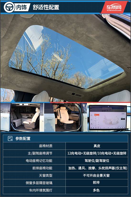 舒適性配置方面,評測車配備不可開啟全景天窗,面積寬大,有著出色的透光性。座椅材質(zhì)為真皮,支持多向電動調(diào)節(jié)且填充物較為柔軟,再加上前排座椅加熱、通風(fēng)以及按摩等功能,乘坐舒適性表現(xiàn)值得肯定。不僅如此,極氪MIX的主/副駕座椅支持270°電動無級旋轉(zhuǎn),將前排座椅轉(zhuǎn)向后方時(shí),便開啟了歡聚對坐模式,可以跟朋友打摜蛋、吃火鍋等;將座椅轉(zhuǎn)向車側(cè)時(shí),會形成垂釣?zāi)J健M瑫r(shí),配合可移動的靈動中島,車內(nèi)能實(shí)現(xiàn)9+N空間場景模式,成為名副其實(shí)的百變空間,用戶只需要通過觸控屏或語音指令就能夠?qū)崿F(xiàn)一鍵布局。但美中不足的是,座椅旋轉(zhuǎn)調(diào)節(jié)的速度有些偏慢。