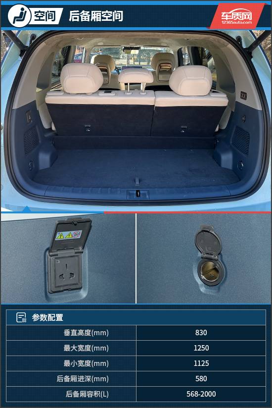極氪MIX的后備廂較為規(guī)整,在常規(guī)狀態(tài)下,內(nèi)部容積達(dá)到568L,可以放置不少物品。當(dāng)?shù)诙抛畏诺购螅藭r(shí)后備廂容積提升至2000L。此外,評測車的后備廂還配備了220V電源以及12V電源接口,可滿足多種用電需求。