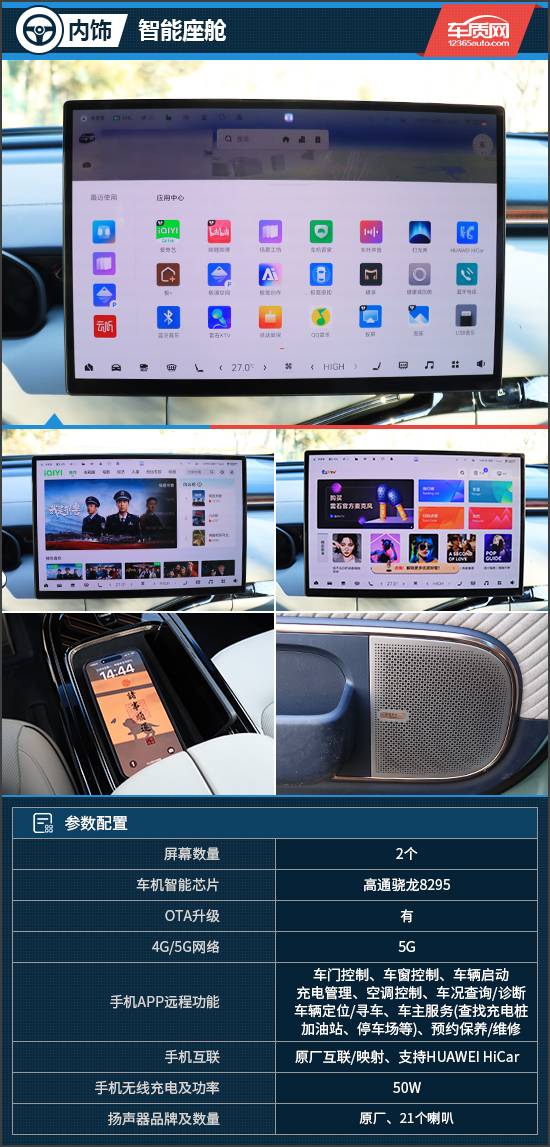 中控屏的尺寸為15.05英寸,分辨率達(dá)到2.5K,顯示效果出色。車機(jī)內(nèi)置了高通驍龍8295芯片,系統(tǒng)算力和反應(yīng)速度也十分出眾。此外,車機(jī)還具有四區(qū)域語音喚醒識別、可見即可說、手勢控制以及聲紋識別功能,智能交互表現(xiàn)達(dá)到同級領(lǐng)先水平。