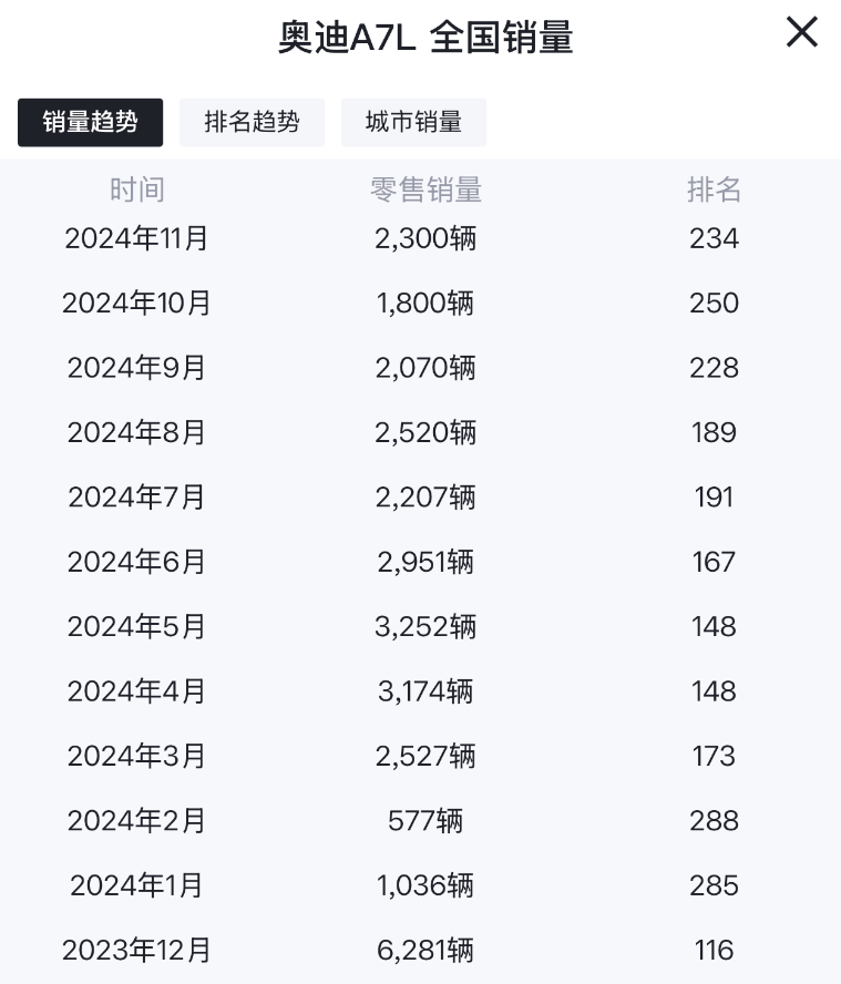 要知道,在銷量上漲的此前兩個月,也就是2024年9月、10月,奧迪A7L的單月零售銷量連續兩個月呈現出環比走低的態勢。