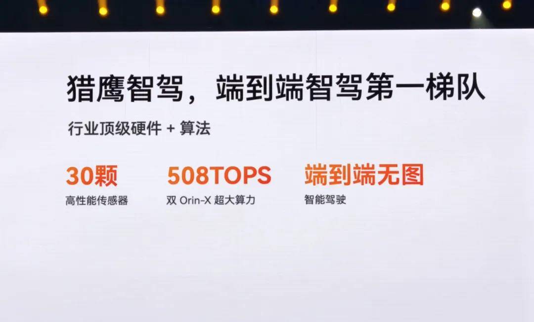 智駕也進行了升級,新車搭載獵鷹智駕,搭配30顆高性能傳感器+算力為508TOPS的雙Orin-X芯片,能夠實現高速領航、城市領航、智能泊車等功能,而端到端的無圖智駕需要到明年一季度才能覆蓋全國。