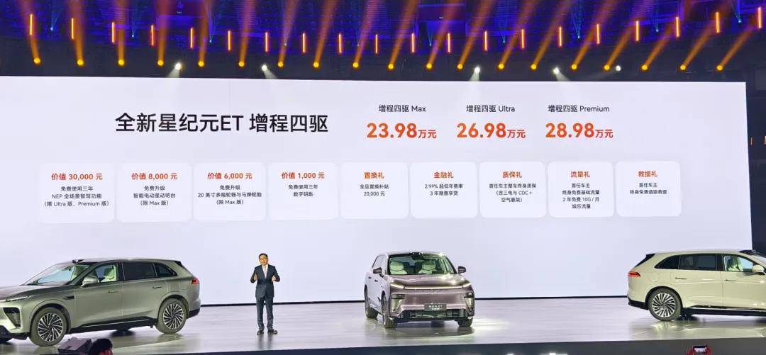 這次呢,星紀元ET增程四驅的價格也是非常有誠意,售價區間為23.98萬-28.98萬元,如果大家有舊車置換的話,那么新車的置換價區間為21.98萬-26.98萬元。