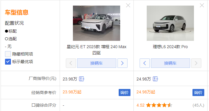 咱們先從價格來看,星紀元ET增程四驅起售價為23.98萬,理想L起售價為24.98萬,前者比后者便宜一萬元,顯然星紀元ET增程四驅比較有優勢一點。