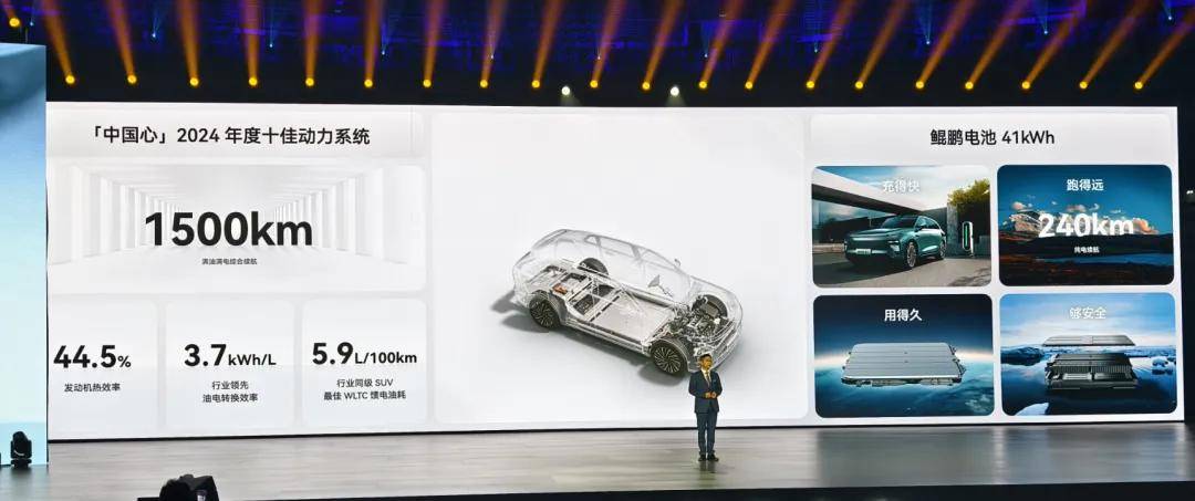 最后的“王炸”就是新車搭載的黃金增程系統,發動機熱效率為44.5%,1L油可發3.7度電,WLTC饋電油耗低至5.9L/100km,純電續航達240km,綜合續航達1500km,大家覺得這個續航能力是什么水平呢?