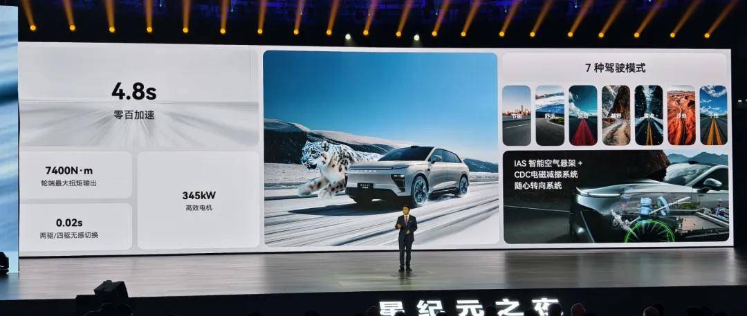 新車搭載的是雪豹四驅,是在原本云臺智能底盤的基礎上進階的產物,可實現0-100%前后軸智能扭矩分配,提供越野、雪地、沙地等7大場景駕駛模式。