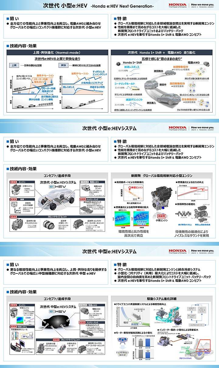 本田目前主打的油電系統 e:HEV,其也運用在自家絕大多數車款上,具備 3 種不同模式的駕駛情境,包括僅使用電池電力行駛的「EV 驅動模式」、利用引擎發電并由馬達驅動的「混合驅動模式」,以及將引擎與離合器直接連接以驅動的「引擎驅動模式」;而就在近期原廠更是推出了新世代的 e:HEV 技術,原廠表示將在小型和中型系統中對引擎、驅動單元等組件及控制技術進行革新,旨在進一步減少對環境負擔和行駛性能。