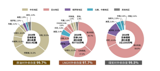 有數據提到,在2019年時,日本石油、液化天然氣、煤炭的對外依存度分別高達99.7%、97.5%、99.3%。