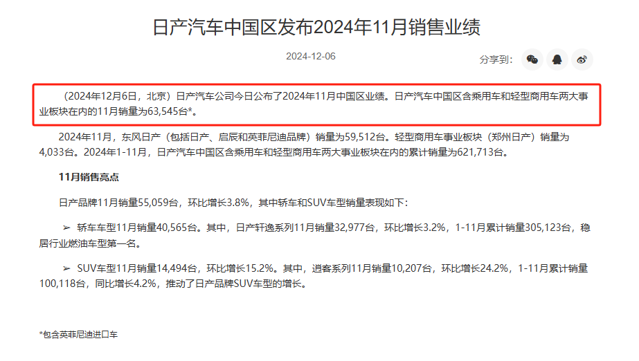 數據顯示,在2024年1-11月,本田在中國汽車市場的銷量為740399輛,去年同期為1068383輛,而今年1-11月,日產在中國的銷量為621713輛,去年同期為694895輛。