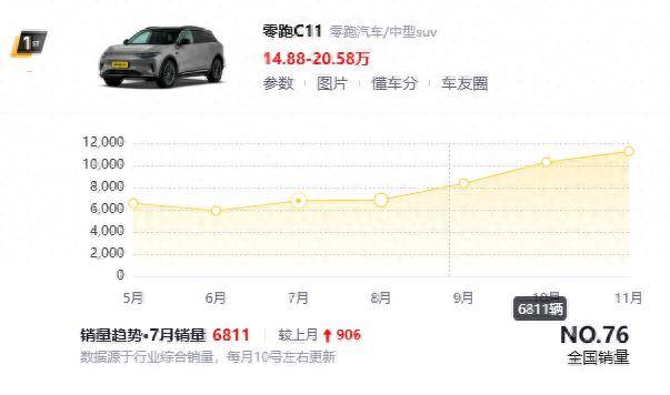 11月份零跑C11的銷量達到了11260輛,較上月增長974輛,在15-20萬元區間的新能源SUV中銷量僅次于深藍S07,后者在11月售出12021輛。