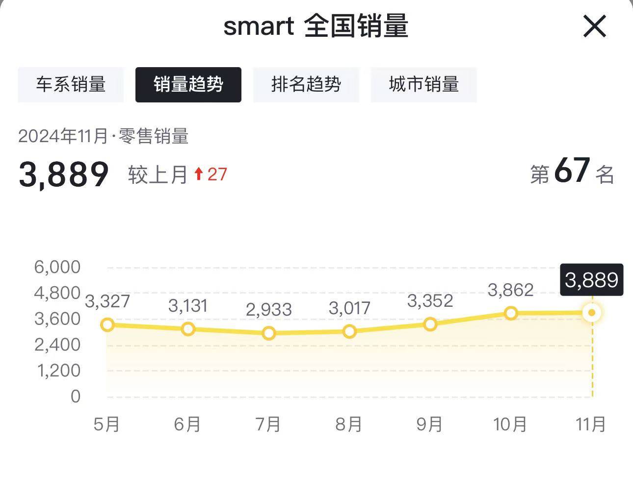 根據最新的銷量數據顯示,在11月份smart整體銷量僅為3889輛,甚至不及當前熱門車型單月銷量的零頭。而要知道smart旗下已經布局了三款車型,其中在10月份更是推出了全新的smart精靈#5,但是依然對銷量提升沒有多大的帶動作用,在11月其銷量僅為300輛。