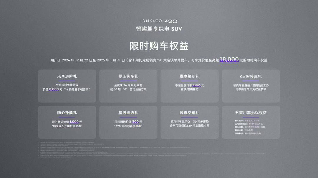 與此同時,即日起至2025年1月31日期間完成領克Z20大定鎖單并提車,可享受價值至高1.8萬元的限時購車權益,包括全系限時免費升級價值8000元的14揚聲器哈曼卡頓音響、不限品牌4000元置換增購補貼以及零壓購車禮等等,整體來說還是極具誠意。