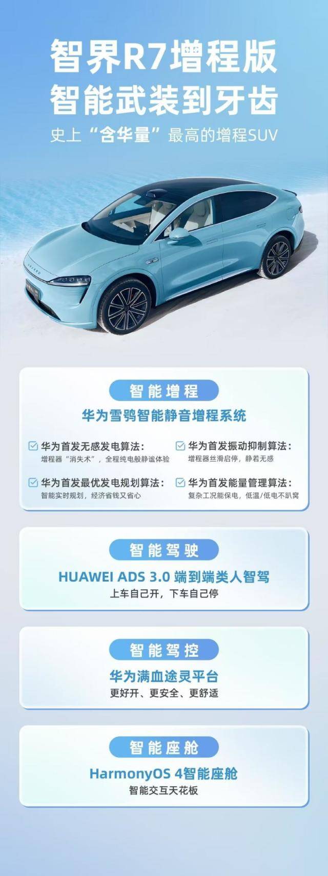 在業界領先的增程技術之外,智界R7增程版也和純電版同步搭載了一系列華為硬核黑科技,例如首“滿血”途靈平臺、HarmonyOS 4智能座艙、HUAWEI ADS 3.0高階智能駕駛系統,為用戶帶來獨屬鴻蒙智行的未來出行新體驗。