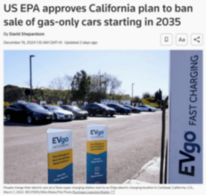 本周三(12月18日),美國環保署(EPA)正式批準了加州一項重要計劃——從2035年起,禁止銷售新的燃油汽車。