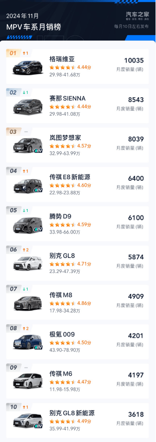 11月份MPV銷量排行榜前十名出爐,新能源MPV和燃油車MPV各占5席位,MPV市場(chǎng)的新能源MPV越來(lái)越多,小眾市場(chǎng)也不小眾了。