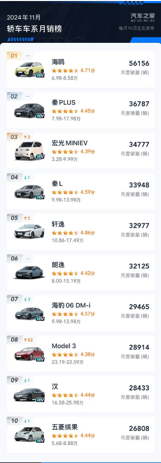 11月份轎車銷量排行榜前十名出爐,燃油車就剩三款車了,一起來(lái)看看吧!
