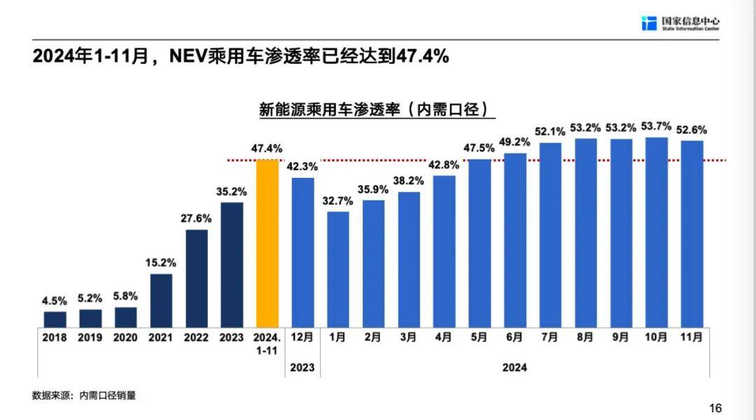 電動車前11個月的滲透率達到了47.4%,100輛車中有47.4輛是新能源車,去年的數據是35.2%,漲了大概12個百分點。今年跟以往不一樣,以往批發滲透率35.2%,終端零售大概是33%,差2個點,今年情況是終端零售(保險數字的滲透率)跟批發滲透率一樣,實際上從終端來講,這是非常快的速度。