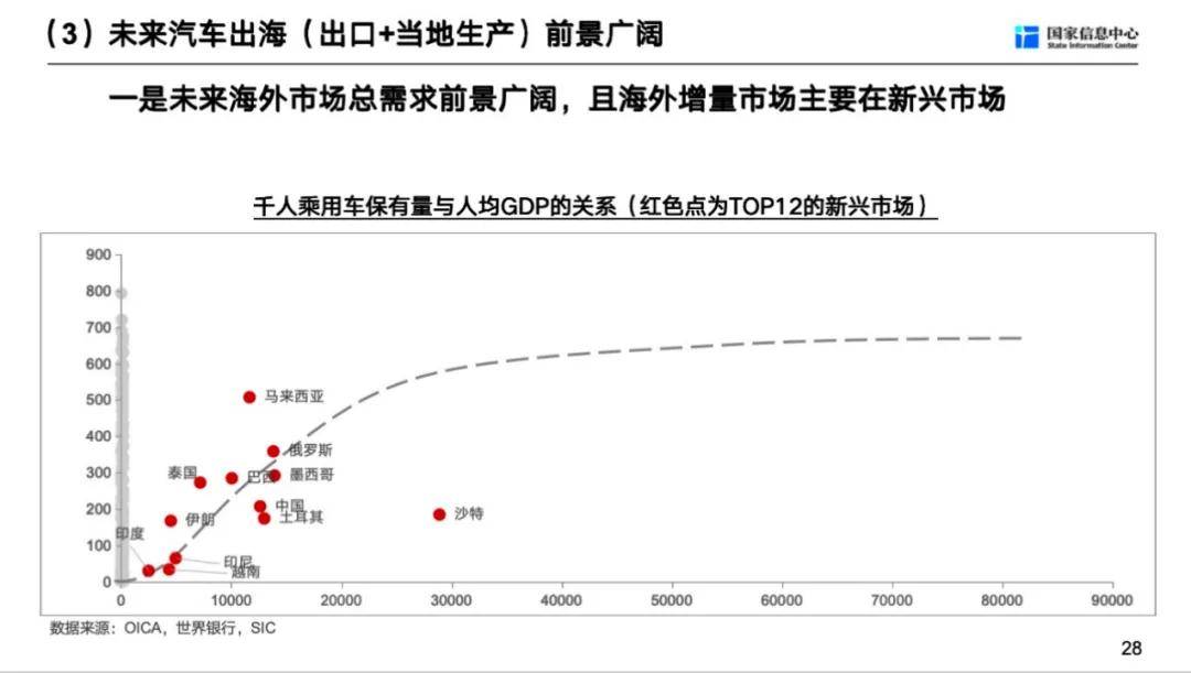 2萬~3萬美元之間時,斜線比較緩,增速最快的階段在人均1000~10000美元之間,1萬~2萬美元次之,現在還有很多國家人均GDP在1000美元以下或1000~2000美元之間,但人口又很多,比如越南有1億人口,土耳其8000多萬人口,印尼2.8億人口,只要人均GDP漲,汽車需求就會漲。未來全球汽車市場增量主要在新興和發展中國家市場,這些國家只要經濟發展,汽車銷量就會比較好。
