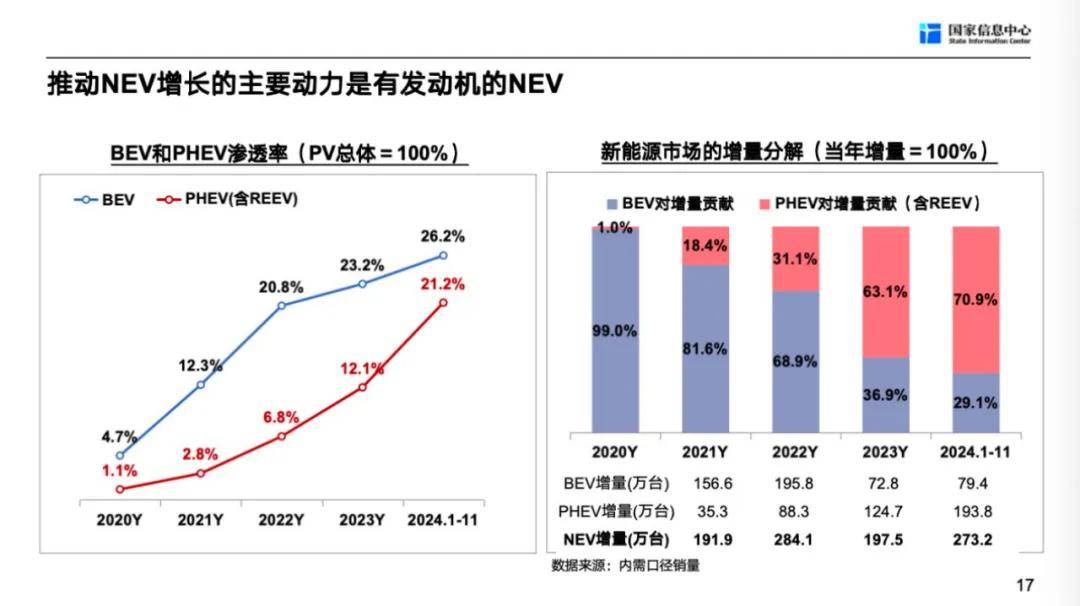 同時他指出,2024年1~11月,NEV乘用車滲透率已經達到47.4%,推動NEV增長的主要動力是有發動機的NEV,這由三個原因促成:一是供給側產品推動消費者認知發生了轉變,而且產品力在持續提高;二是消費者需求偏好拉動,新型PHEV比純油車有更強的經濟性、更好的駕駛感和科技感,并且沒有BEV的里程焦慮;三是車購稅、養路費、車船稅等相關政策的加持。