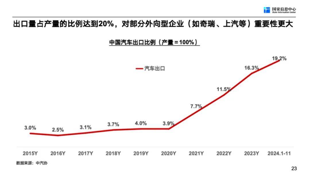 我們出口在海外的位勢快速提高,一方面來自外需市場對我們國家汽車產業的重要性,汽車出口占我們產量的百分比,原來是3%~4%,作用很小,而今年前11個月達到19.2%,這意味著我們國家每生產100輛車,有接近20輛出口,80輛在國內銷售。奇瑞公司出口占其產量的40%多。