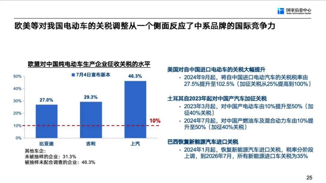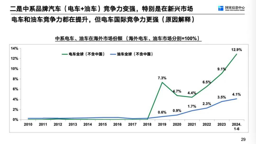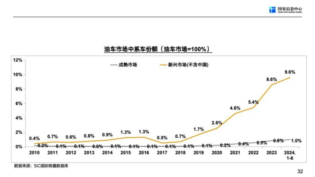 油車不如電動車競爭力強,但也都在提高,成熟市場里每賣100輛油車我們占1輛。我們的油車在成熟市場、在發達國家不太容易賣出去,但是在新興市場中份額接近10%,10輛車有1輛,成熟市場100輛有1輛,競爭力不一樣。總的來說都是在提高,特別是在新興市場。未來增量市場在新興市場,而新興市場里,不管是電動車還是油車,我們競爭力都比較強。所以我們有理由認為將來汽車出口還會有一個比較好的發展。