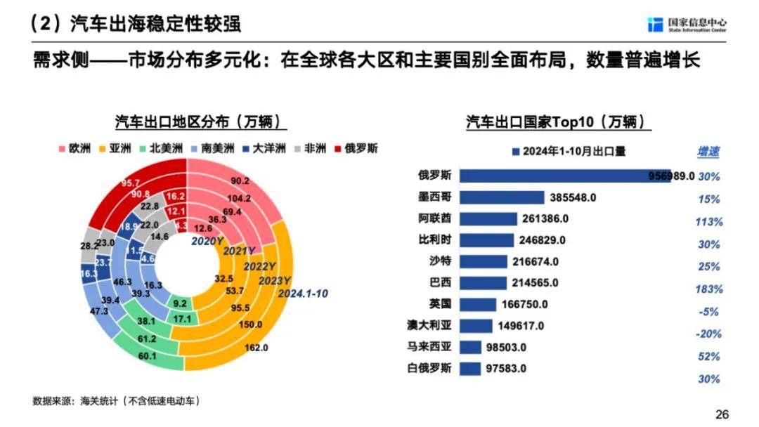 出海穩定性比較強。一方面反映在需求側,市場分布多元化,風險就小。今年前10個月我們在亞洲出口量是162萬輛、歐洲也是一直漲,今年前10個月超過90萬輛、俄羅斯出口前10個月到95.7萬輛,其他大洲也都在漲,不斷放大,穩定性比較強,那么多國家、那么多地區都有,即使一個地區受影響,風險也不大。