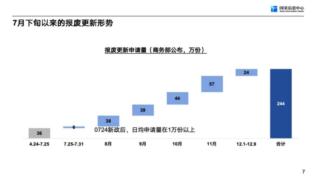 在4月份之前,大概一天是4000輛的報廢更新申請,90天申請約36萬輛;8月份和9月份,申請量分別為38萬輛和39萬輛,平均每天大概有1.3萬輛的報廢申請;10月份是44萬輛,平均一天1.5萬人申請;11月份到57萬輛,差不多一天2萬人在申請。這說明政策推動的效果越來越大。