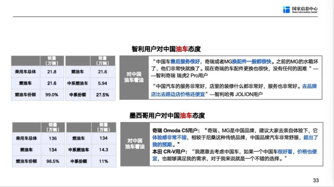 成熟市場對中系油車不太接受,但是在在新興市場接受度還是蠻高的,智利用戶,一個是奇瑞車主,一個是哈弗車主,都評價很高,奇瑞或者MG換配件一般都很快,汽車服務都很好。總的來說評價都很不錯。我們在智利油車市場里占27.5%,每賣100輛油車,我們占27.5輛,在墨西哥每賣100輛油車有我們11輛。在新興市場我們都還是不錯的。