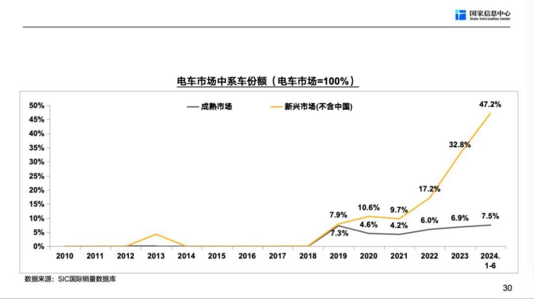 我們的電動車在成熟市場占有率在提高,但是比較緩,從2020年的4.6%到目前的7.5%,但是我們電動車在新興市場占有率,從2020年的10.6%提升到了現在的47.2%,新興市場每賣100輛電動車,我們要占47輛。全球成熟市場是41個國家和地區,人口11億;新興市場除我們之外有170多個,這些市場合一塊,中系NEV占比達到47%。電動車競爭力確實比較強,特別是新興市場。