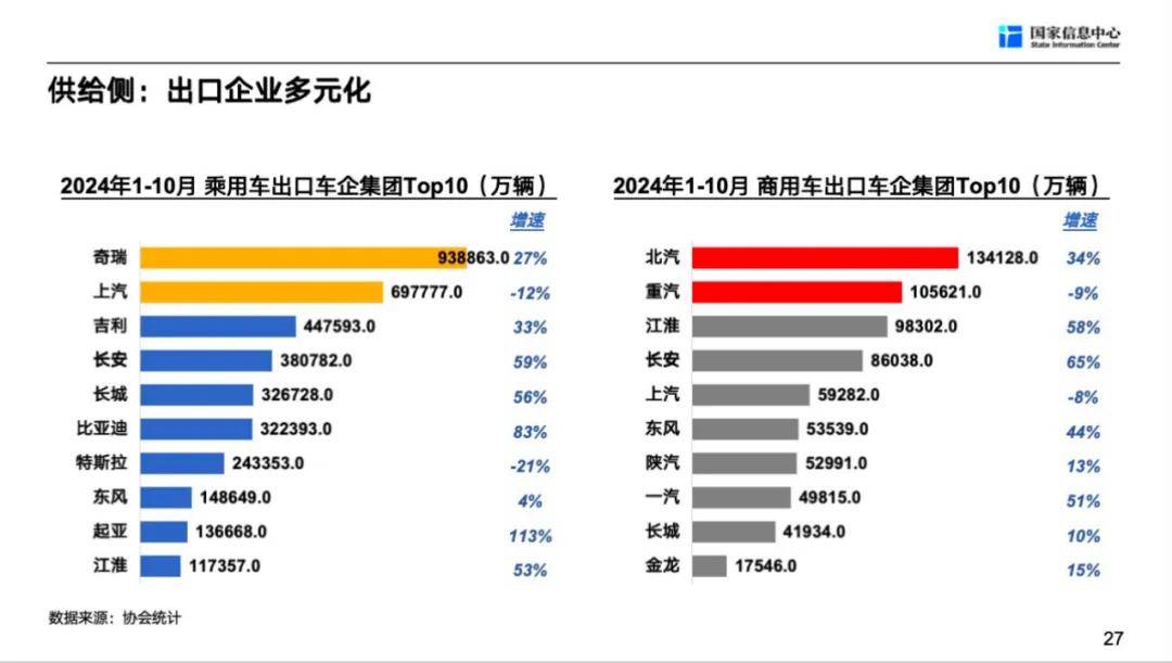 從供給側來看,我國的出口企業也比較多元化。奇瑞今年前10個月出口93.9萬輛,全年應該能達到120多萬輛,上汽出口大概70萬輛,以及其他出口30萬輛~40萬輛的企業還有很多,我們的汽車出口結構不是一家獨大,是有梯度的,各個企業都在做。