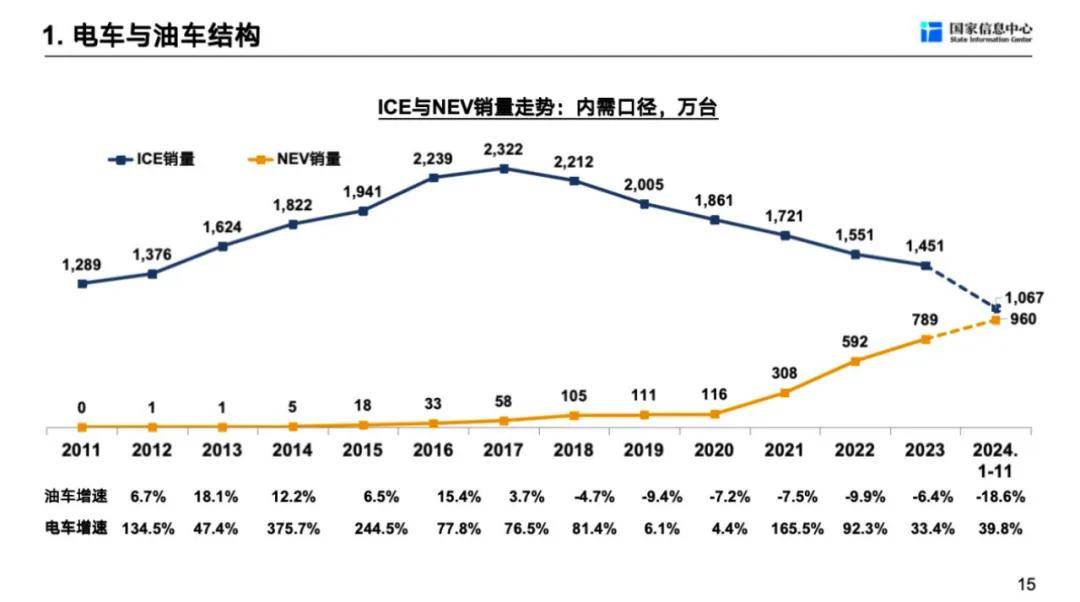 再來看看電動車和油車的增長速度。今年電動車銷量前11個月同比增長39.8%,油車下降了18.6%,到今年油車已經是連續第七年下降,跟高峰時的2322萬輛相比,少了1000多萬輛,下降幅度比較大,這是很大的變化。