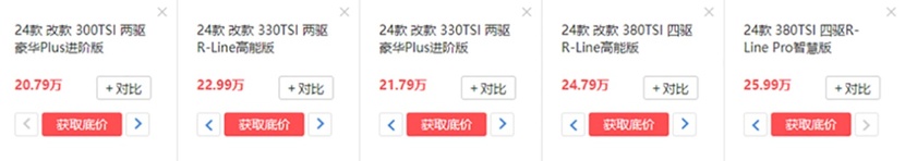 如果對動力有一定的需求,偏愛2.0T車型,那么兩款330TSI車型也可以考慮,兩驅R-Line高能版采用運動外觀,還比豪華Plus進階版多出了全景影像、矩陣大燈、座椅加熱等功能,可以根據自己的需求選擇。