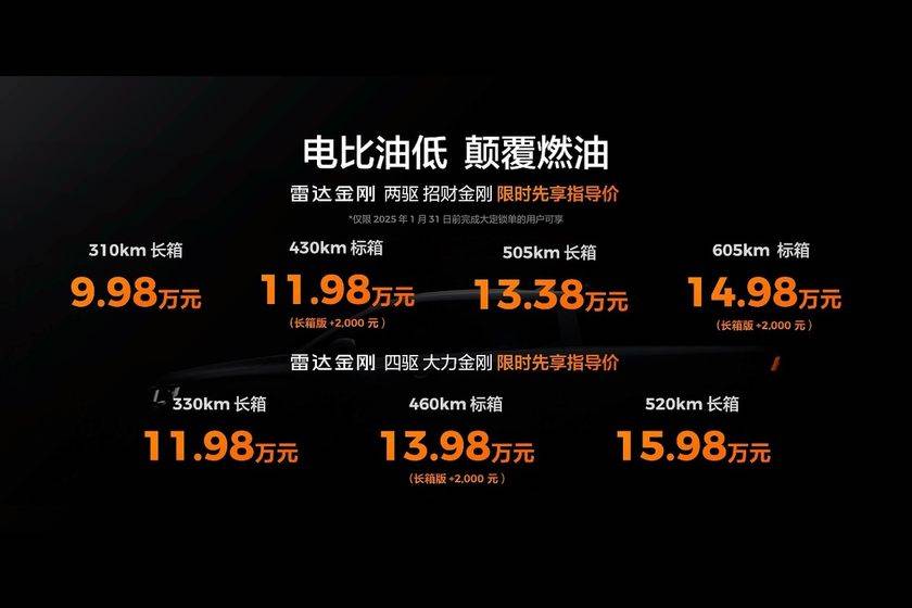 12月23日,定位全球商乘兩用純電皮卡的雷達(dá)金剛正式上市。2025年1月31日前鎖單的用戶,還可享受限時(shí)先享指導(dǎo)價(jià)。兩驅(qū)版招財(cái)金剛 9.98萬(wàn)元起;四驅(qū)版大力金剛11.98萬(wàn)元起。雷達(dá)金剛以電比油低的方式,顛覆傳統(tǒng)燃油皮卡,既是一臺(tái)最具動(dòng)力顛覆、省錢(qián)顛覆、操控顛覆、安全顛覆的純電皮卡,價(jià)格又極具競(jìng)爭(zhēng)力,是一臺(tái)十萬(wàn)級(jí)最值得買(mǎi)的純電皮卡。