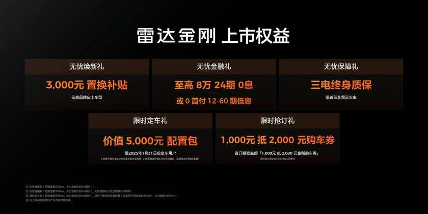本次發(fā)布會(huì),吉利雷達(dá)還推出了專(zhuān)屬上市權(quán)益,包括三電終身質(zhì)保、至高8萬(wàn)24期免息(或0首付12-60期低息)、3000元置換補(bǔ)貼的無(wú)憂三重禮(置換補(bǔ)貼與金融貼息二選一),以及還有價(jià)值5000元的限時(shí)定車(chē)禮、1000元抵2000元的限時(shí)搶訂禮。