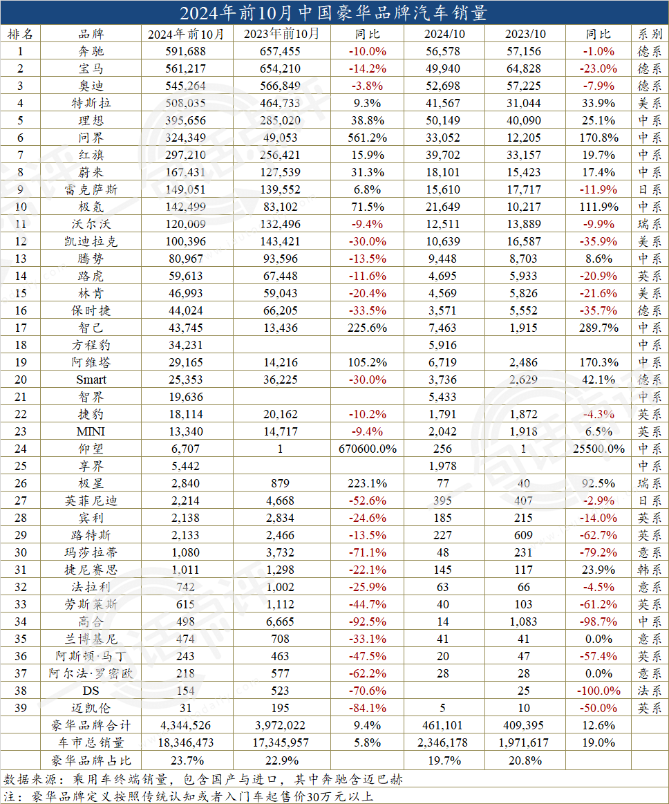 整體來看,盡管確實有部分傳統豪華品牌損失慘重,但依靠新能源高端品牌們的迅猛發展,尤其是理想、問界、蔚來、極氪、阿維塔和方程豹等自主品牌的強力推動,今年前10個月國內豪華車累計售出434.5萬輛,同比增長9.4%,遠遠超過整體乘用車市場的5.8%。