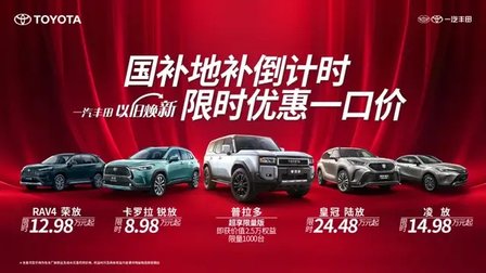 值得一提的是,面向全年銷售目標及份額挑戰,12月1日-31日,一汽豐田國補+廠補繼續加碼,推出“國補地補以舊煥新限時優惠一口價”活動,至高可享2.3萬超級置換補貼,另有豐厚入廠、保養禮品及多重金融政策;價格直降優惠力度空前,最佳購車時機不容錯過。不同于其他車企"為卷而卷"、盲目跟從的做法,一汽豐田的“限時優惠一口價”可謂是把誠意拉滿!旗下包括全新普拉多、RAV4榮放、卡羅拉銳放、皇冠陸放等在內的各細分市場熱門車型,均有著不同幅度的優惠政策,足以窺見一汽豐田普惠用戶、讓利消費者的決心。