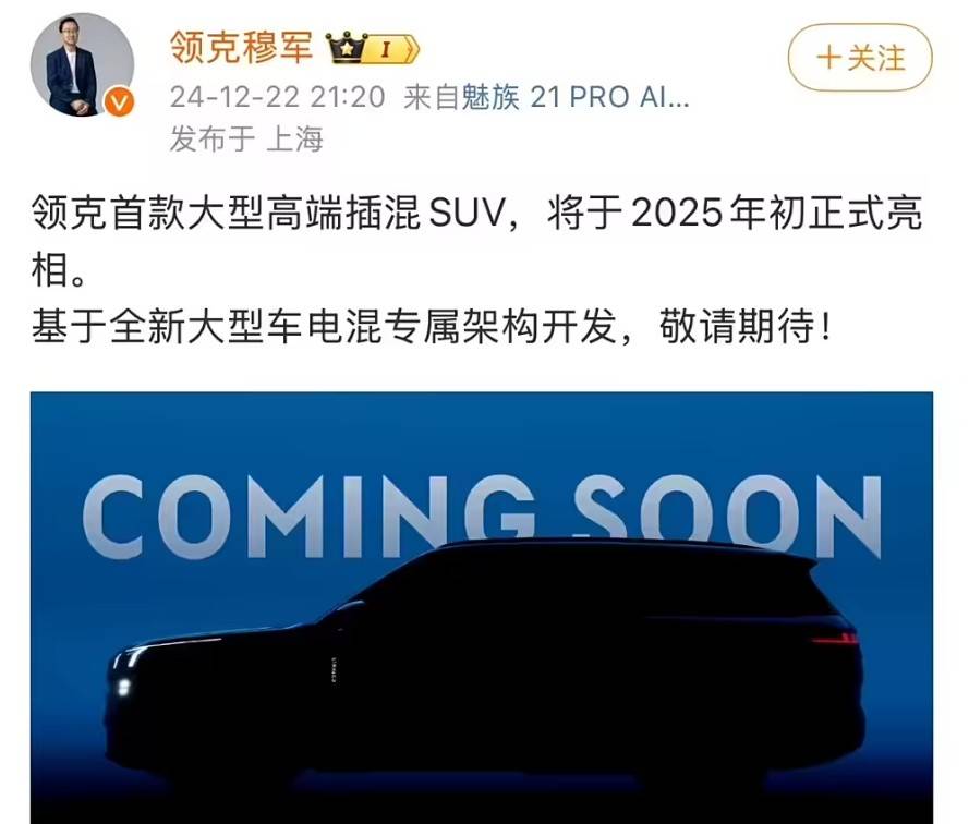 在12月23日舉行的領(lǐng)克Z20上市發(fā)布會(huì)上,領(lǐng)克官方表示:領(lǐng)克品牌首款大型高端插混SUV(內(nèi)部代號(hào)L946),將于2025年初正式亮相。